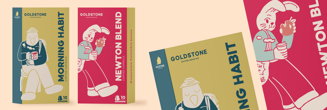 งานออกแบบแพ็คเกจแคปซูลกาแฟจากแบรนด์ GOLDSTONE ที่หยิบความมินิมอลมาผสมความมีชีวิตชีวาได้ลงตัว คาแรคเตอร์แต่ละตัวบอกเล่ารสชาติผ่านภาพลักษณ์แบบน่ารักแต่ไม่เด็ก—สไตล์ GOLDSTONE เค้าแหละ! ☕ “Morning Habit” – กล่องโทนเหลืองทอง-น้ำเงิน ให้ฟีลอบอุ่นเหมือนแดดเช้า ตัวละครเป็นนกหนุ่มสุดชิลในชุดไหมพรม นั่งจิบกาแฟแบบไม่รีบ ชวนให้เช้าไหน ๆ ก็ใจเย็นได้ 🐰 “Newton Blend” – กล่องสีแดงสดโดดเด่น คาแรคเตอร์กระต่ายสายชิล มือหนึ่งถือกาแฟ มือหนึ่งถือแอปเปิ้ล เดินทอดน่องแบบไม่แคร์แรงโน้มถ่วง รสชาตินี้เข้มแต่คูล มีพลังแต่ไม่วู่วาม—คาเฟอีนสายเนิบของจริง แพ็คเกจทั้งสองออกแบบด้วยเส้นสายที่เรียบง่ายแต่มีจังหวะ สีสันชัดเจน อ่านง่าย และที่สำคัญ…น่าหยิบแบบไม่ต้องคิดนาน!