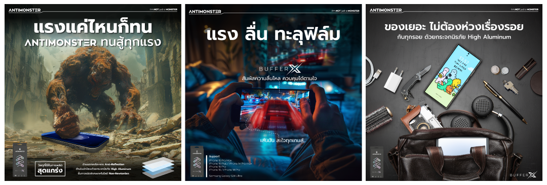 Loop Packaging Design การออกแบบกล่อง Loop ถูกสร้างขึ้นจากแรงบันดาลใจในโลกของเกม ที่เต็มไปด้วยสีสัน ความสนุก และความเคลื่อนไหว เรานำพลังงานเหล่านี้มาใส่ในโทน แดง–น้ำเงิน–เหลือง ที่โดดเด่นบนพื้นดำ อันเป็นเอกลักษณ์ของ Antimonster ทำให้ตัวแพ็กเกจจิ้งดูสนุก น่าดึงดูด แต่ยังคงภาพลักษณ์ที่พรีเมียมและเข้มแข็ง สัญลักษณ์ “∞” ในคำว่า LOOP ไม่เพียงแค่สื่อถึงความต่อเนื่อง แต่ยังสะท้อนถึงความเร็วแรงและทนทานของสายชาร์จ ที่พร้อมใช้งานได้ซ้ำแล้วซ้ำเล่าโดยไม่สะดุด ผลลัพธ์คือบรรจุภัณฑ์ที่ผสมผสาน ความสนุกแบบเกม เข้ากับ ความจริงจังของเทคโนโลยี ได้อย่างลงตัว